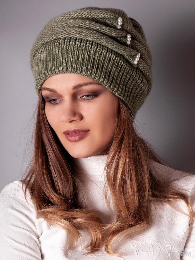 Шапка вязаная женская, три волны, бусинки, оливковый - 399 руб.
