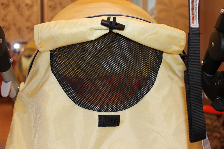 Сзади на капе есть смотровое окошко. Но оно скорее всего предназначено для проветривания, а не для наблюдения, потому что расположено на задней стороне капа и доступно только в разложенном положении спинки.