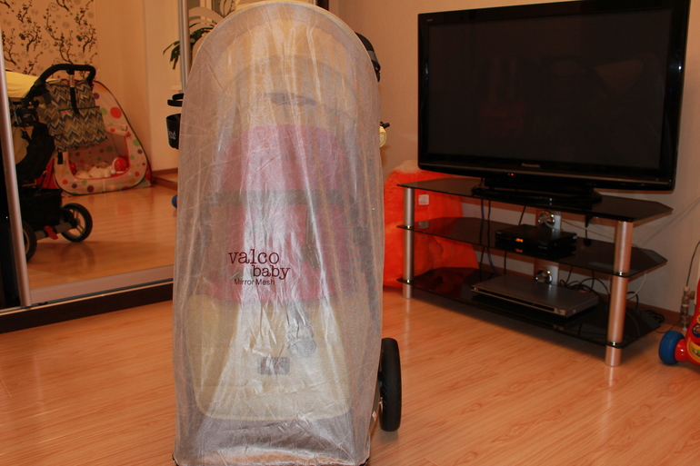 Как ни печально, но в комплекте с коляской нет ни дождевика, ни москитной сетки, ни накидки на ножки, ни сумки для мамы, ни подстаканника. Для нас в условиях северного лета с мошкой и комарами москитка просто необходима как воздух! Мы отдельно все это докупали сразу. Москитка родная Valco Baby с УФ-защитой хорошо закрывает и крепится.