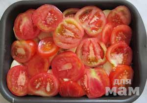 Вынуть противень из духовки и выложить слой помидоров.