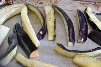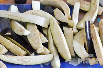 Баклажаны для этого блюда лучше брать небольшие и крепкие, они самые вкусные. Вымыть их, отрезать черешки, разрезать баклажаны вдоль пополам и еще раз вдоль на три полоски.