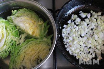 Капусту крупно нарезать и отварить в подсоленной воде до мягкости, но не полной. Молодая капуста варится буквально 3 минуты. Пока варится капуста, мелко рубим лук и обжариваем его до легкой(!) золотистости. Не пережаривайте его, достаточно мягкости и легкого изменения в цвете. Однако, лук можно и не обжаривать, а просто, так же как и капусту, крупно порезать и отварить вместе с последней, затем мелко порубив.
