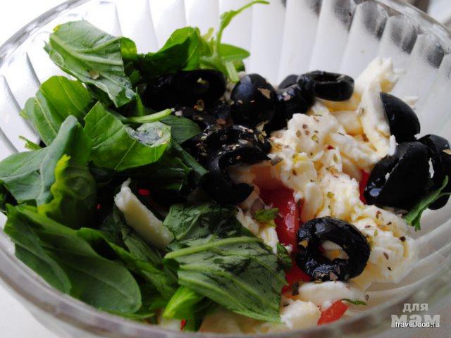 В миске смешиваем помидоры, оливки, сыр и базилик (листья рвем руками). Заливаем оливковым маслом (2 ст.л.) Перемешиваем.
