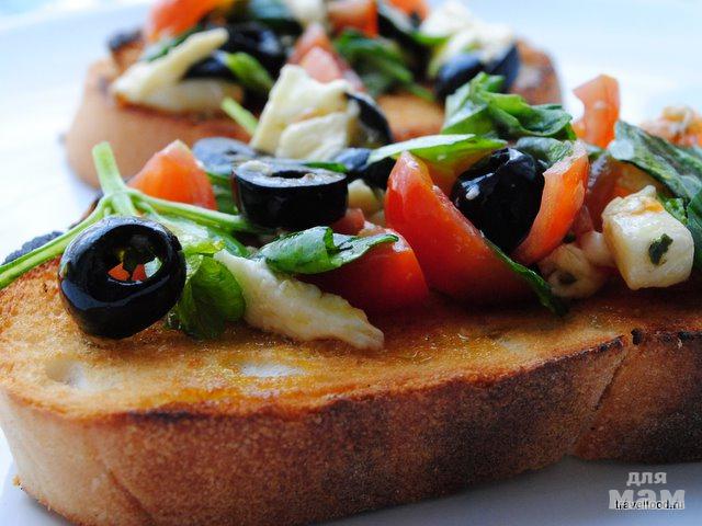 Брускетта - закуска по-итальянски (Bruschetta). Брускетта - «высушенные» кусочки свежего хлеба с чесноком и оливковым маслом. Сверху можно добавить помидоры, моцареллу, оливки, свежий базилик, ветчину и др. Простая еда, главный секрет вкуса которой заключается в качестве продуктов. В нашей семье такой бутер самый-самый (сколько мужиков не корми, а бутерброд на ночь это святое