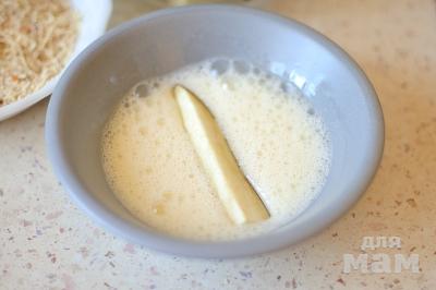 Слегка взбейте яйца. Палочки толщиной примерно 1 см, нарезанные из баклажана, обмакните сначала в яйцо.