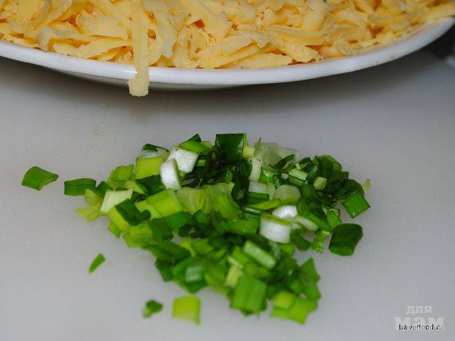 Зеленый лук мелко рубим. Сыр трем на крупной терке.