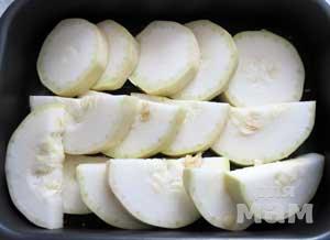 Противень для запекания смазать маслом, выложить в него ломтики кабачков.