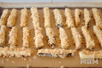 Выложите на подготовленный противень. Запекайте под разогретым грилем в течение 3-5 минут до румяной корочки. Затем достаньте из духовки и переверните каждую палочку. Снова поставьте под гриль еще на 2-4 минуты, пока не подрумянится с другой стороны.