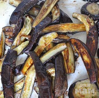 Выложить порезанные баклажаны на противень. Полить маслом и перемешать руками. Баклажаны должны лежать на противне в один слой, если не помещаются, возьмите два противня.