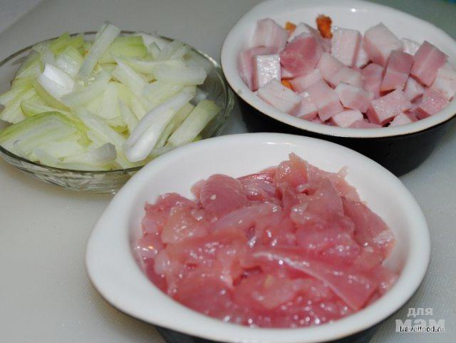 Готовим начинку. Лук, грудинку и курицу нарезаем на небольшие кусочки.