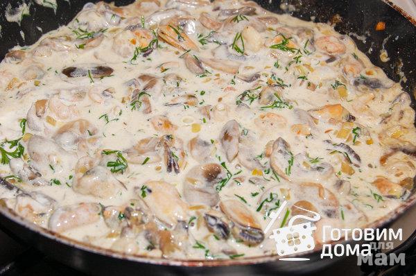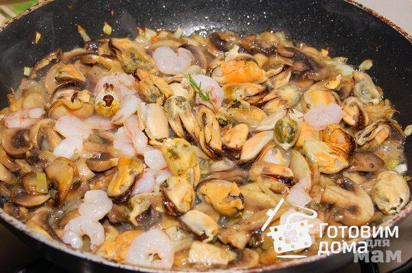 Добавить мидии и креветки (размороженные) и обжарить на среднем огне, помешивая, 3-4 минуты.