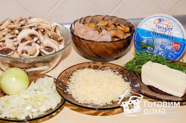 шампиньонымидиикреветкилук репчатыйсметанасыр (типа Российского)масло сливочноезелень укропасольсвежемолотый перец