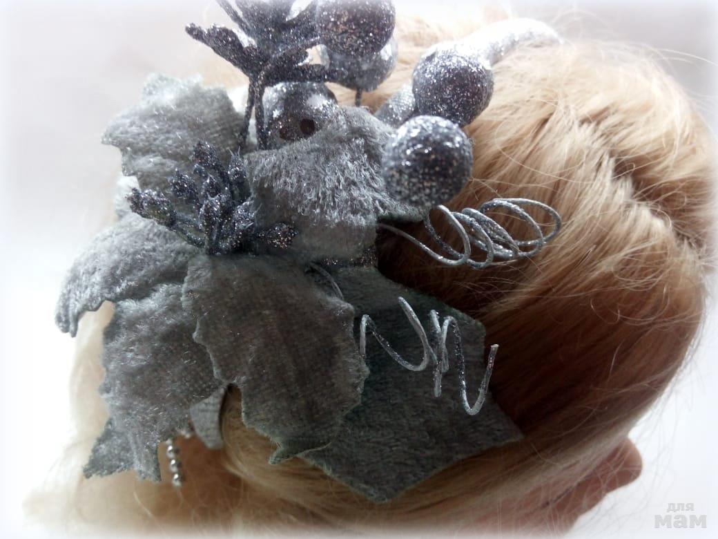3) Ободок "Поцелуй инея". Этот ободок словно околдован морозом. Лепестки, словно в сказке, замерли от прикосновения зимнего волшебника. Даже основа ободочка - это нежный бархат с серебристым люрексом. На самом деле все элементы подвижны и могут "застывать" в любом положении))