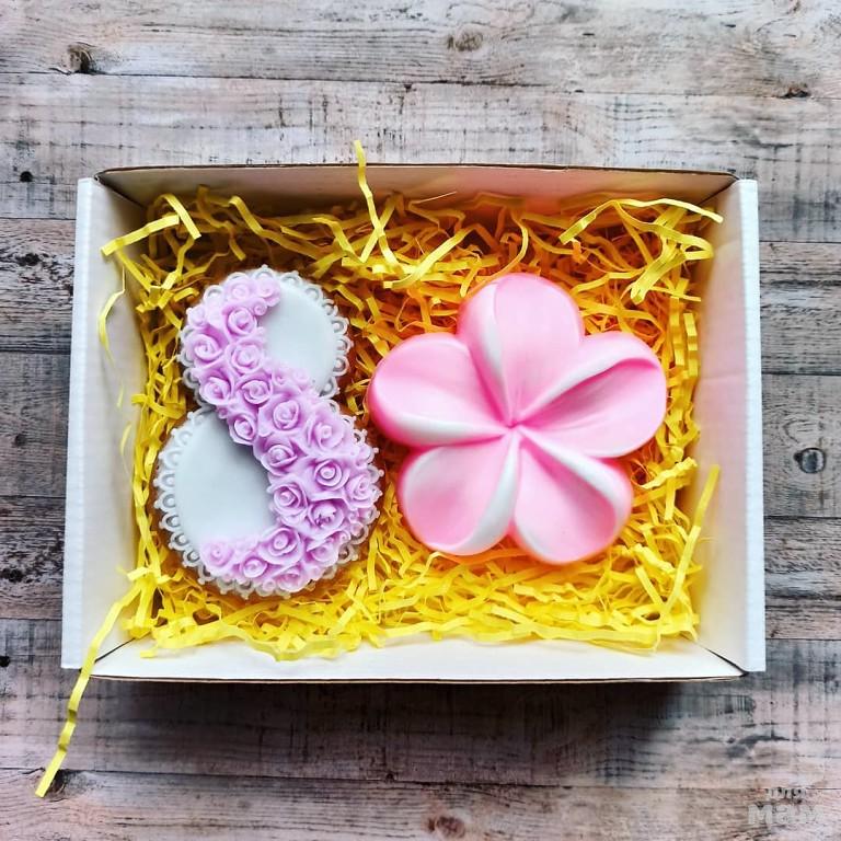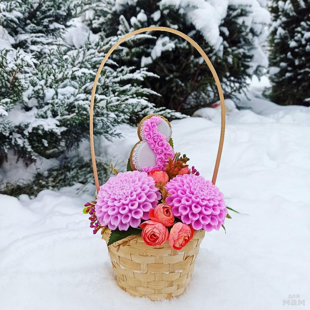 Цветы и цифра выполнены из мыла, корзина дополнена флористическим декором