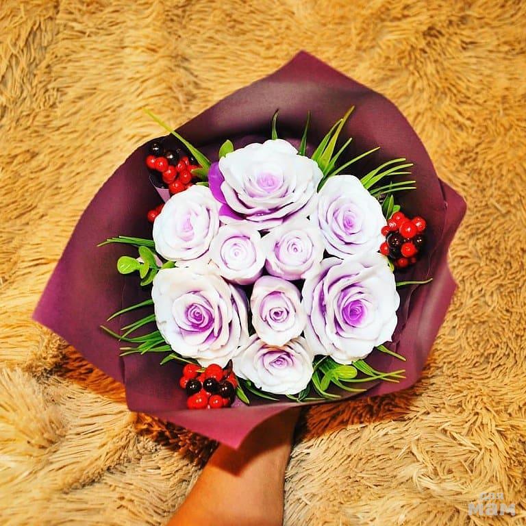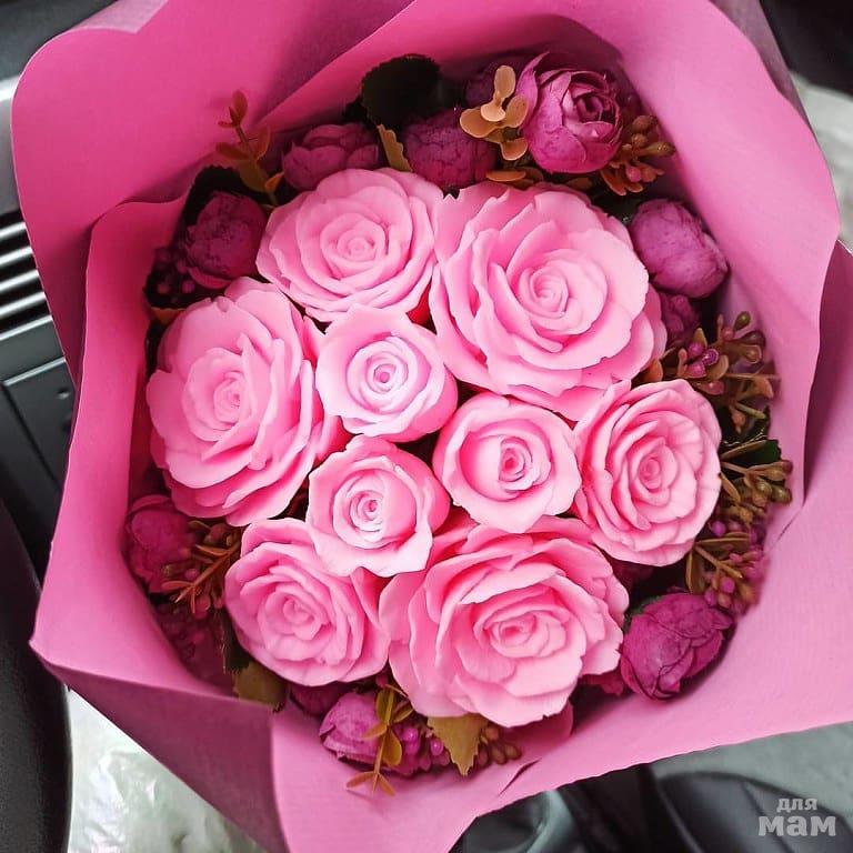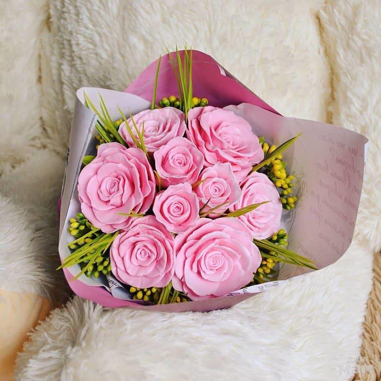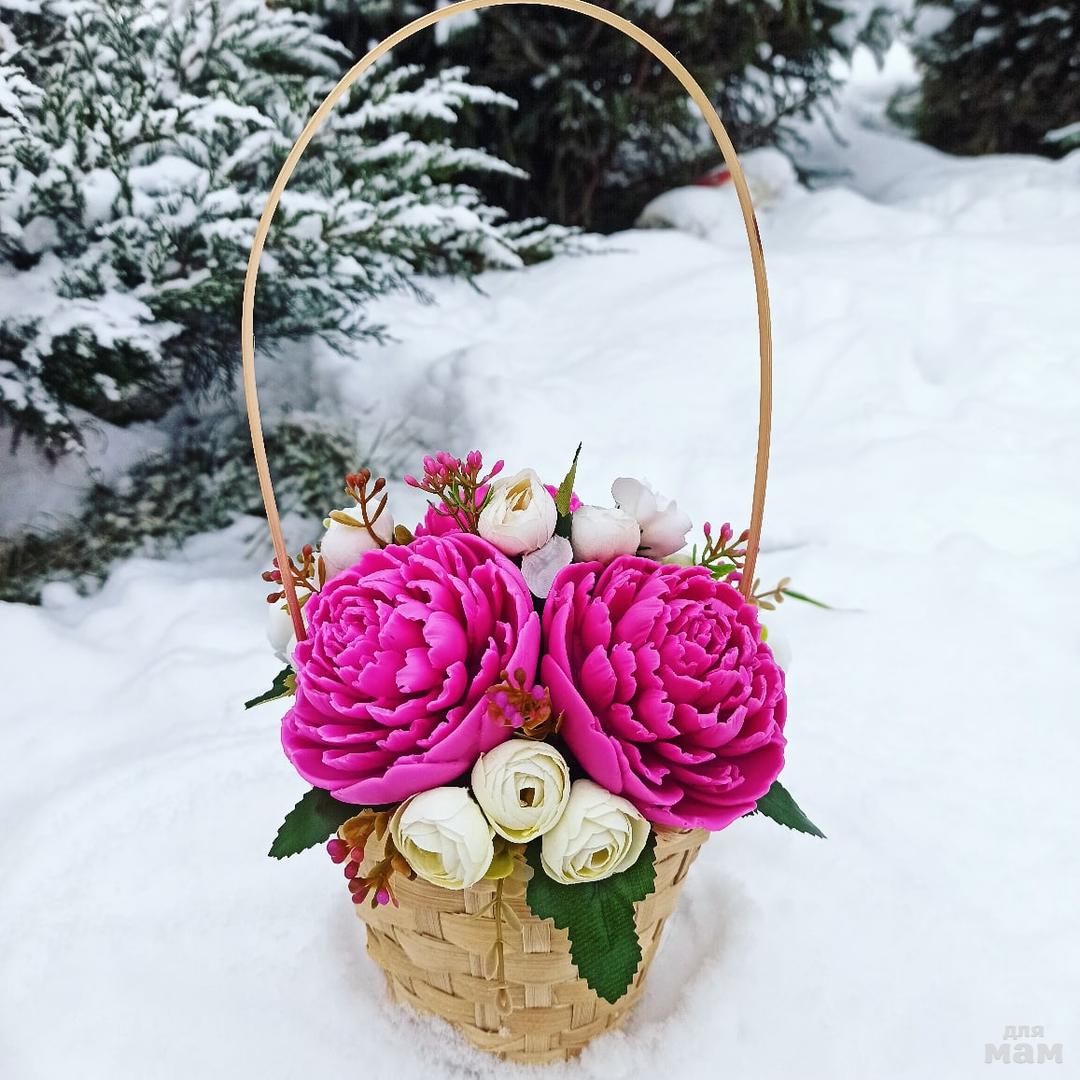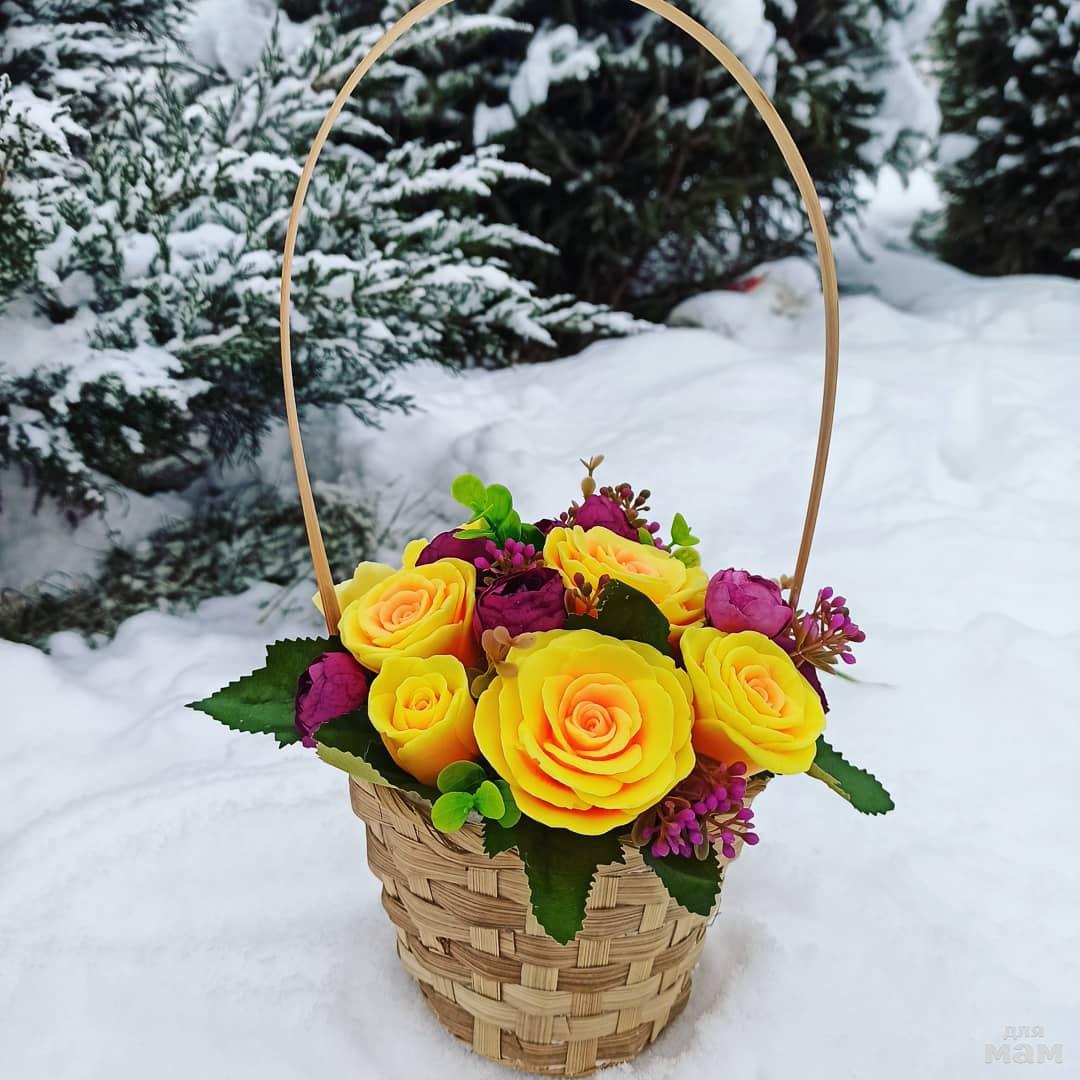 Цветы выполнены из мыла, корзина дополнена флористическим декором