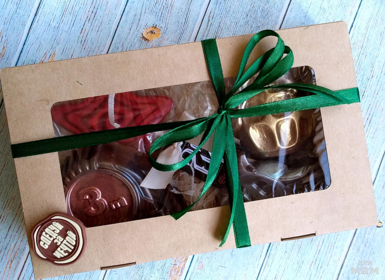 600 руб.Состоит: 3 шоколадки, леденец, упаковывается в крафт-коробку с лентой, также прикрепляется открытка для пожеланий