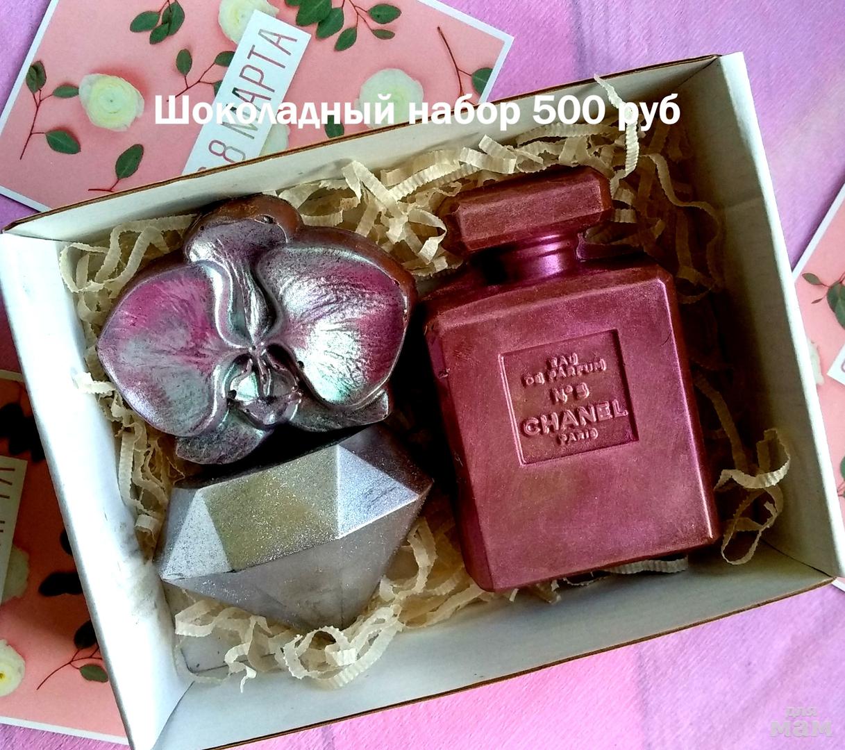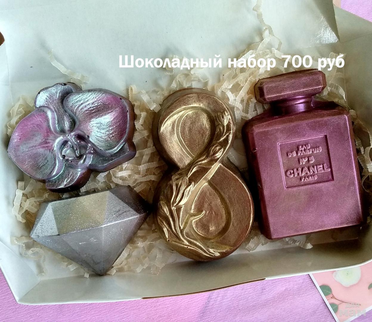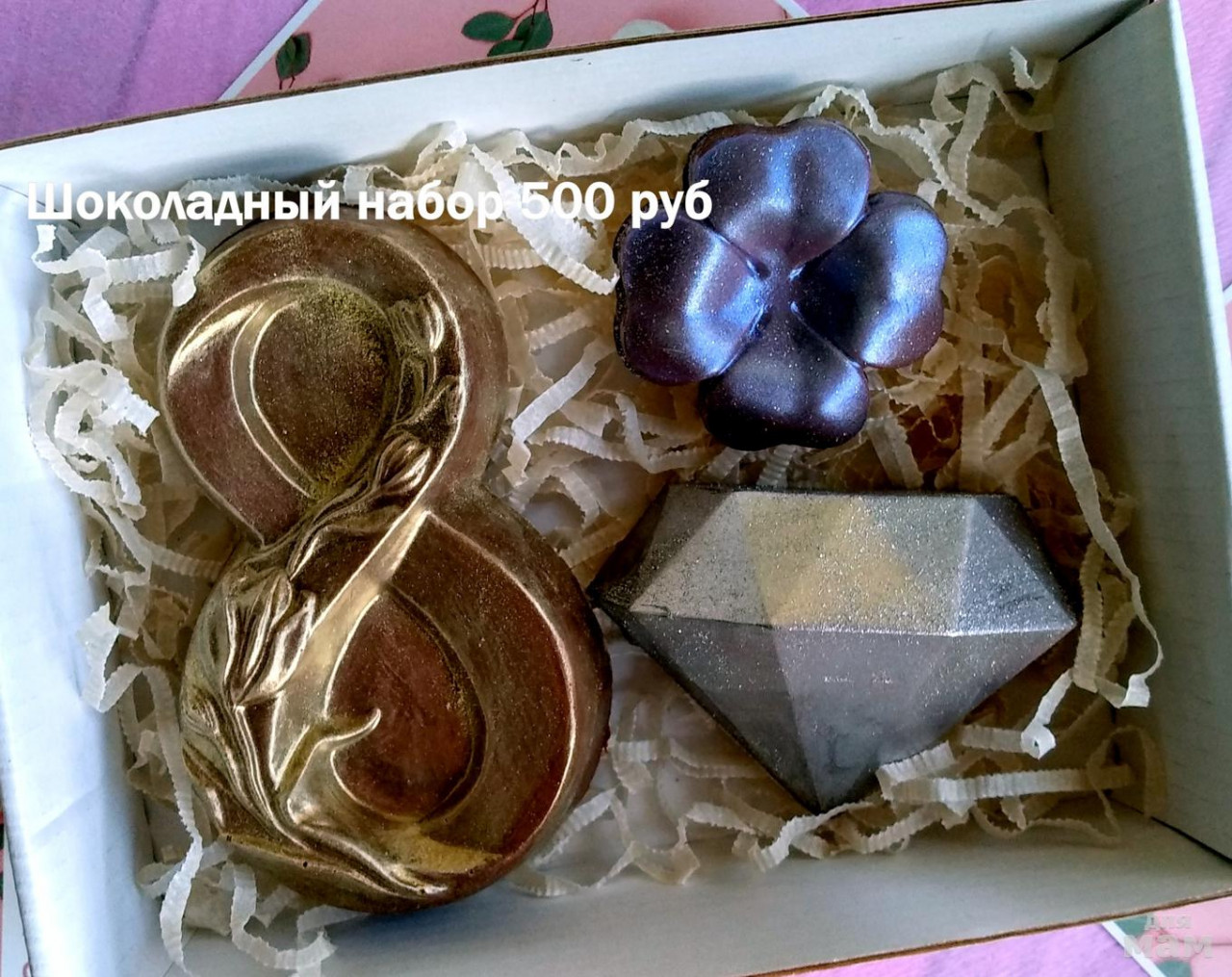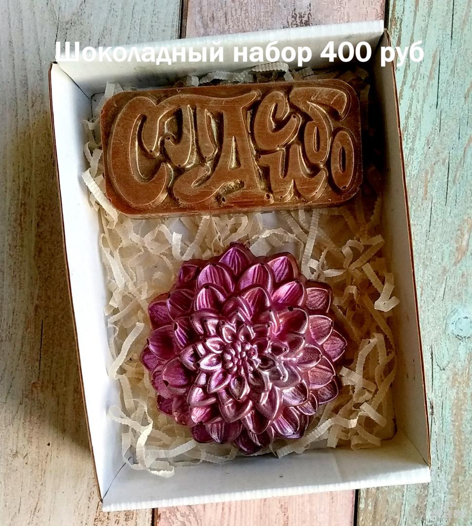 500 руб.Состоит из 4 шоколадок, упаковывается в крафт-коробку с лентой, также прикрепляется открытка для пожеланий