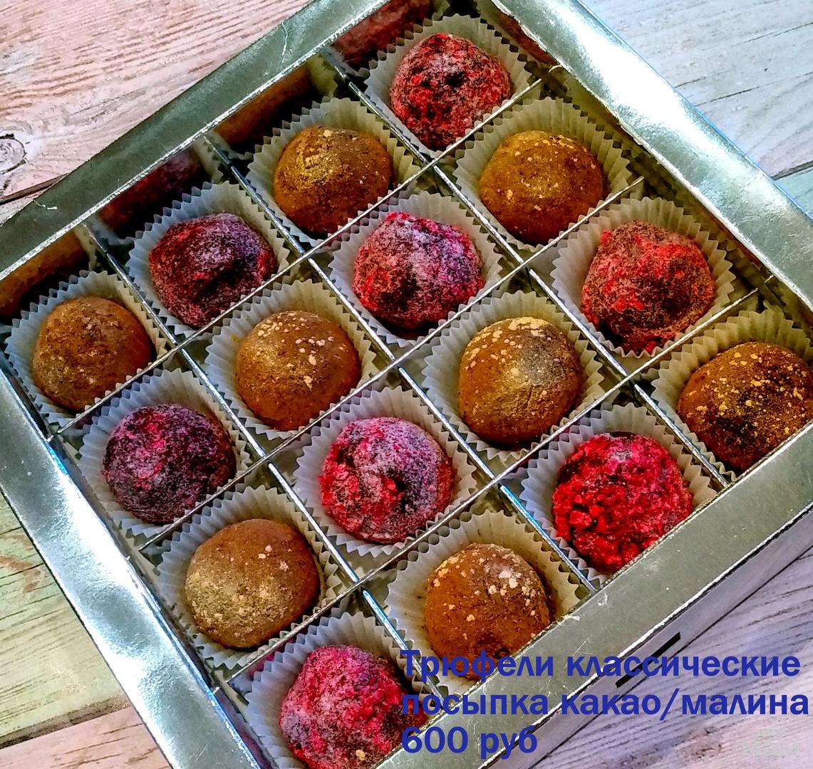16. Трюфели (сливки и молочный шоколад), посыпка какао и сублимированная малина 600 руб