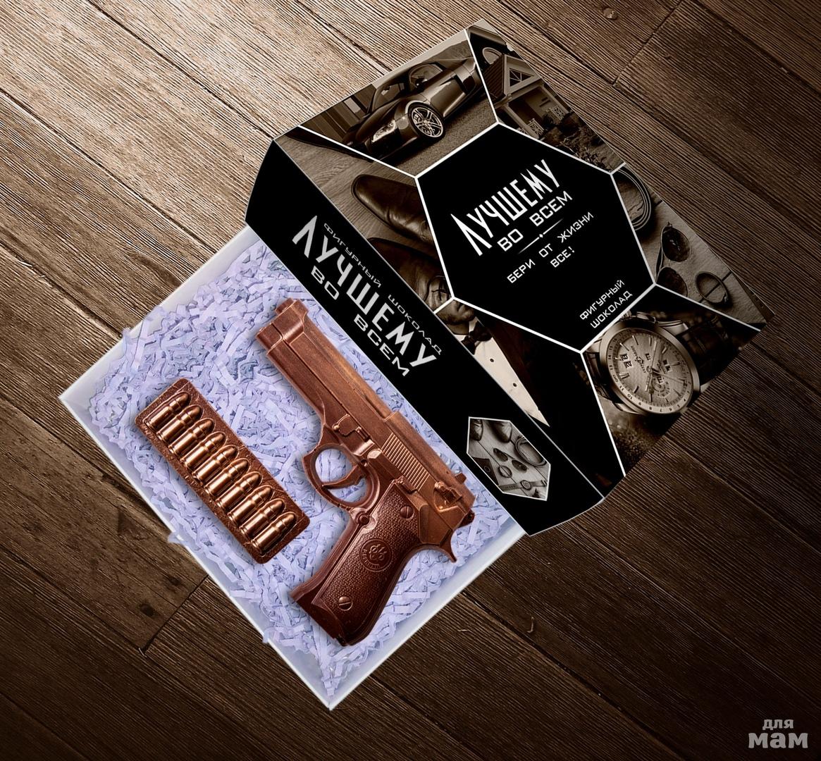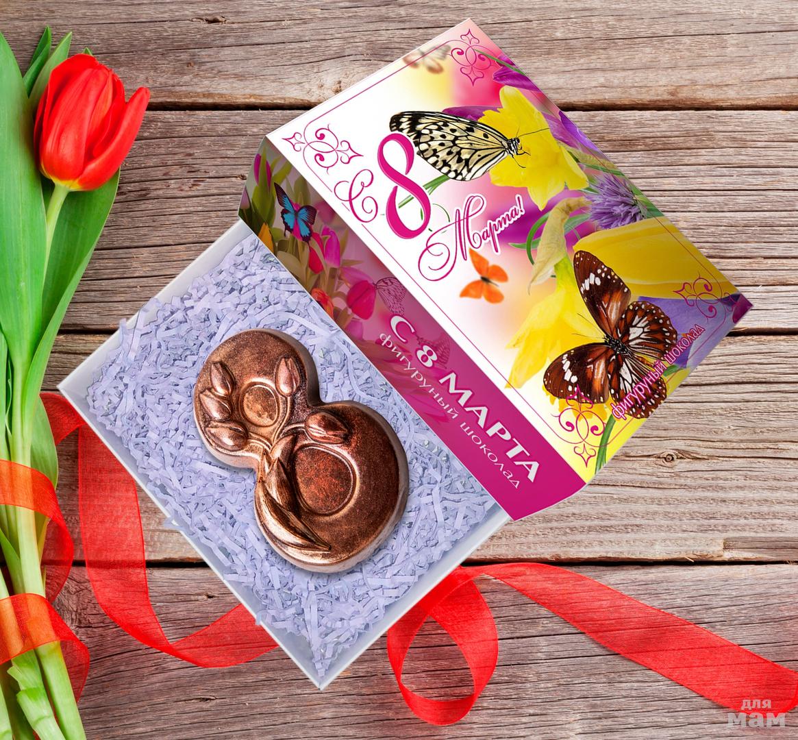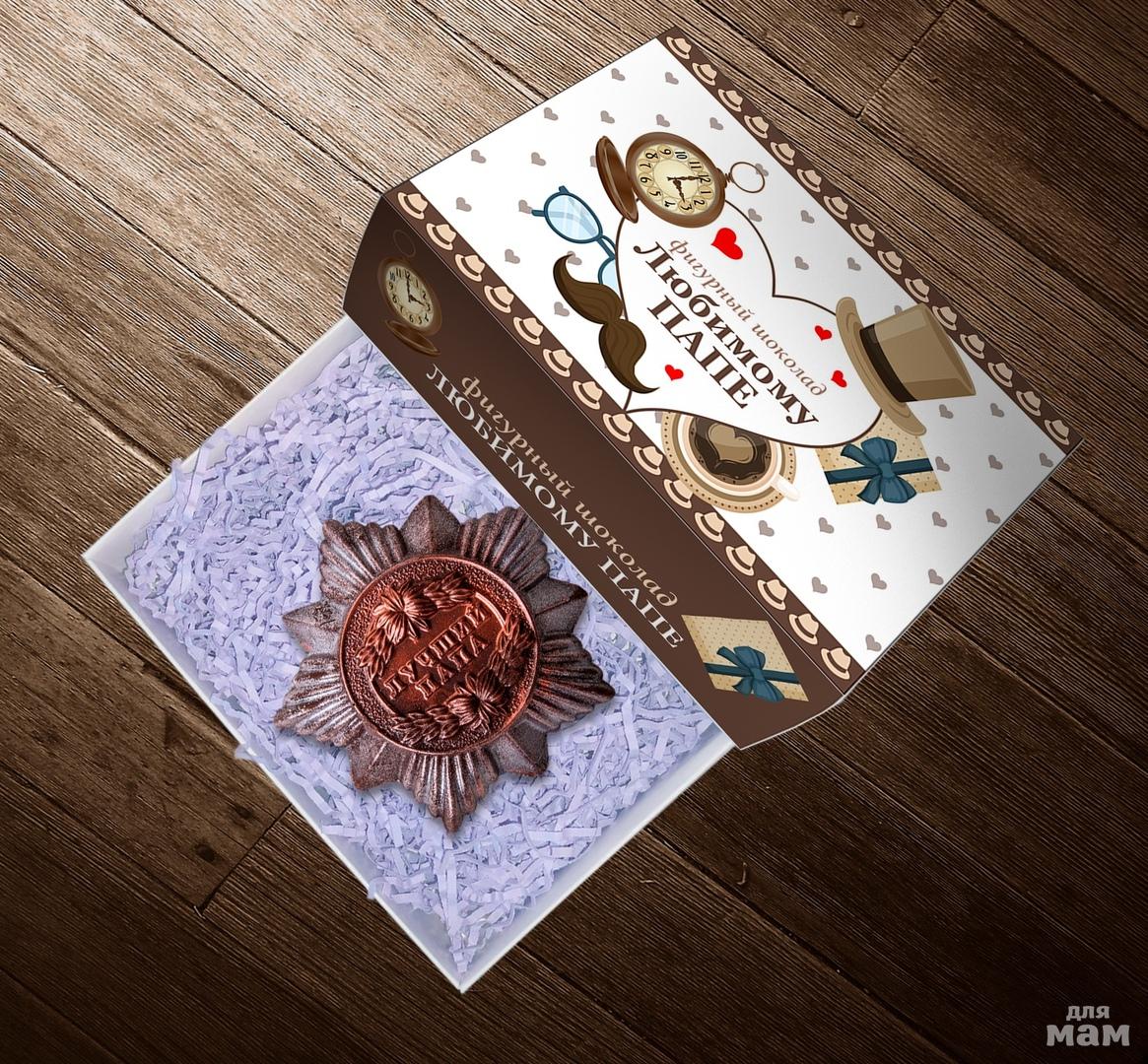 Фигурный шоколад упакован в коробочку с декоративным сеном.