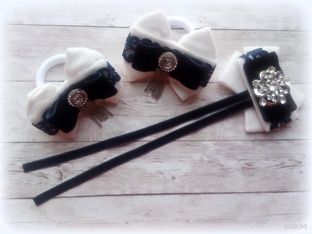 1) Я этот бархатный наборчик пыталась и на темном фоне "поймать" и на светлом, убегает и все тут! Бархат, ажурная лента и очень красивые кабошоны. Размер бантиков примерно 6 см. Специально всю красоту на видное место косичкам посвятила.