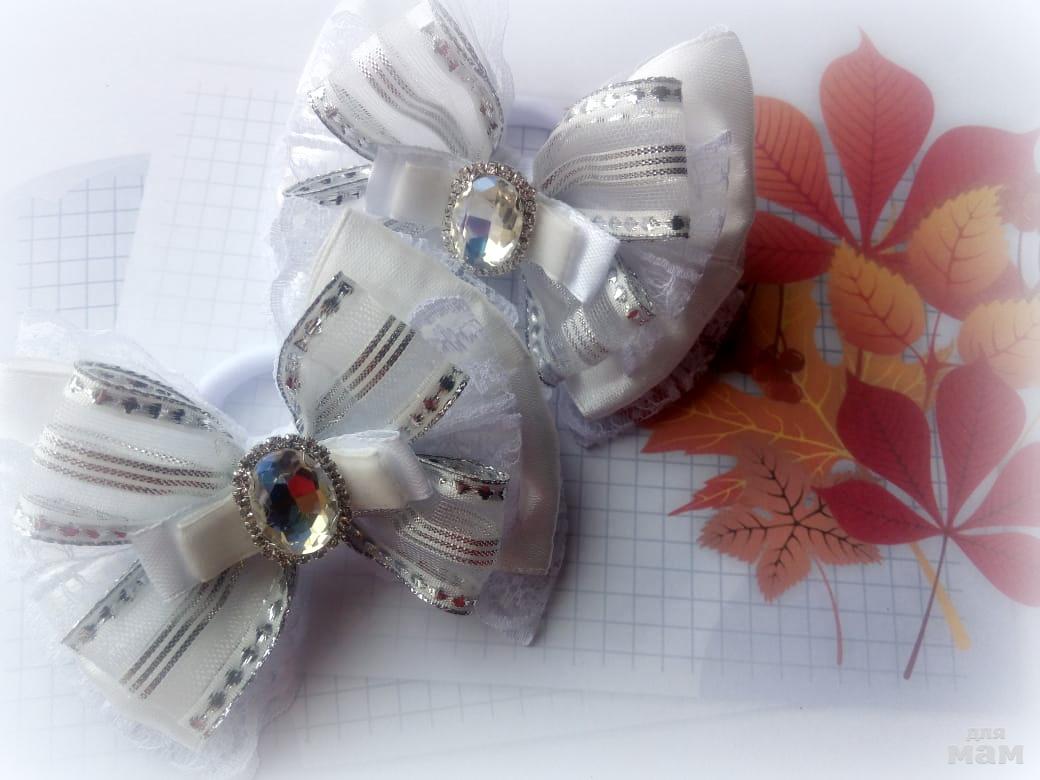 2) Нарядные бантики. Размер 9-10 см. Использовала несколько оттенков белого цвета, чтобы можно было применить как к белоснежным, так и к молочным блузочкам. Очень универсальные!