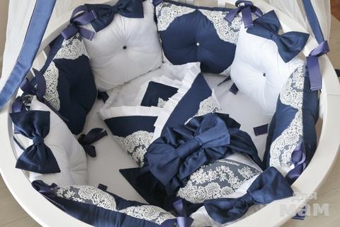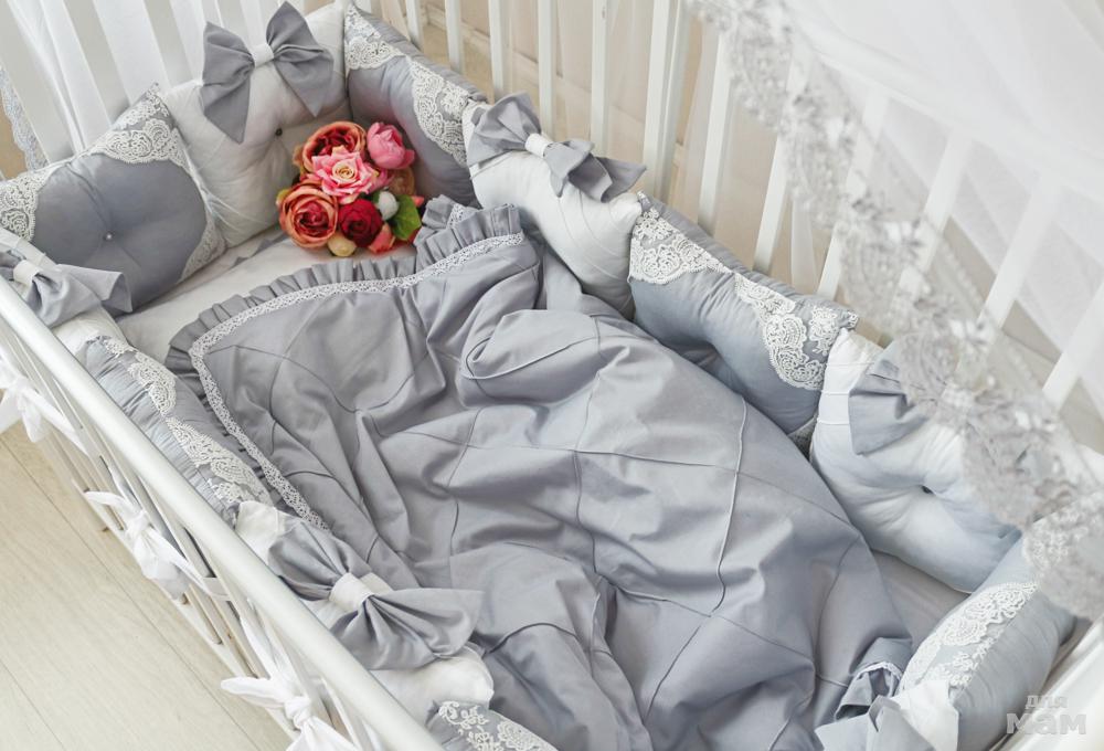 16 предметов: бортики-подушки (12шт). подушка для младенца (1шт), наволочка на подушку (1шт), простынь на резинке (1шт), одеяло - конверт стеганное (1шт). Одеяло из комплекта подойдет для выписки.