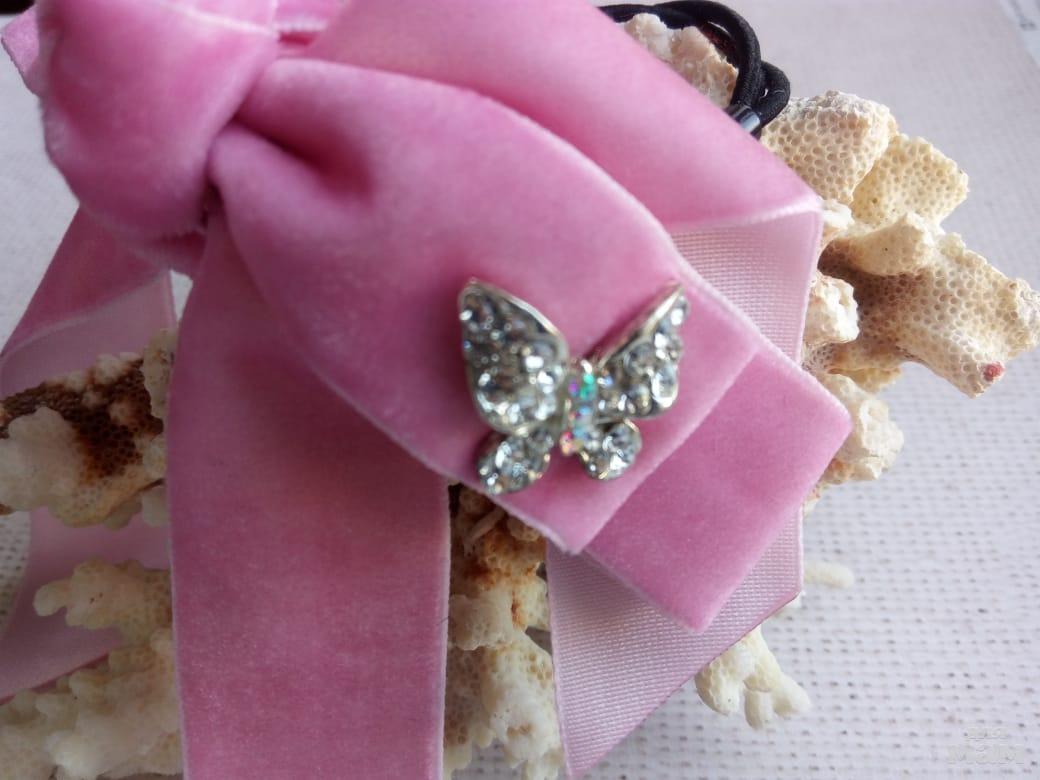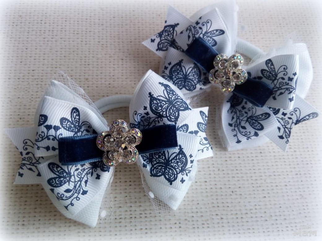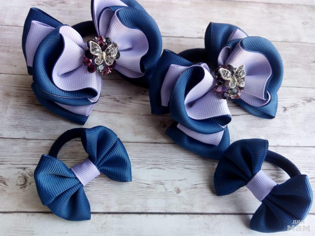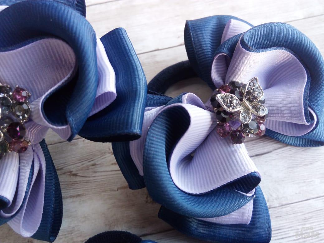 6) Темно-синий с нежным фиолетом. Кабошон бабочка заслуживает отдельного слова. Он просто "Ах"!) Комплект состоит их двух видов бантиков на резиночках. Размер больших 8 см, малышей - 5 см.