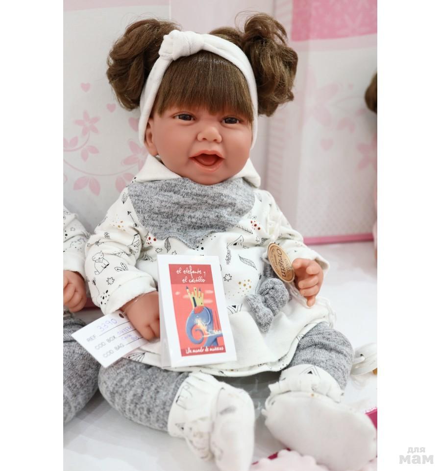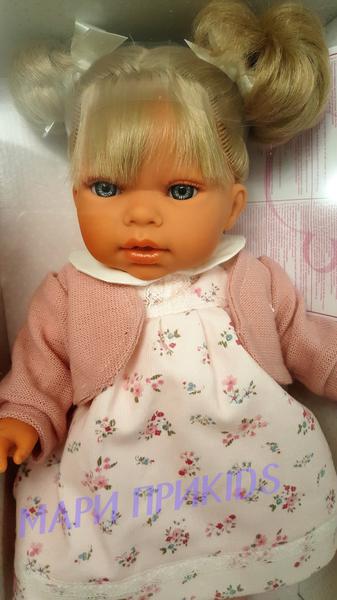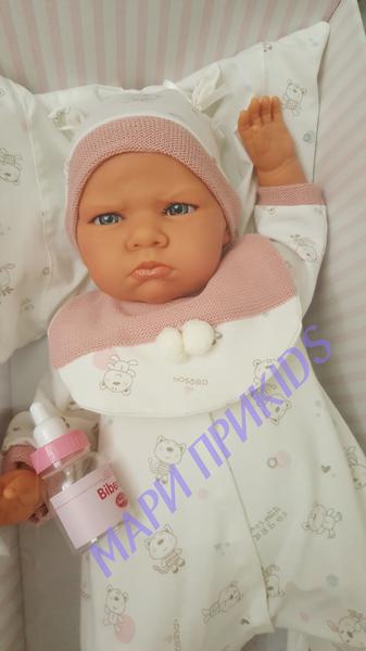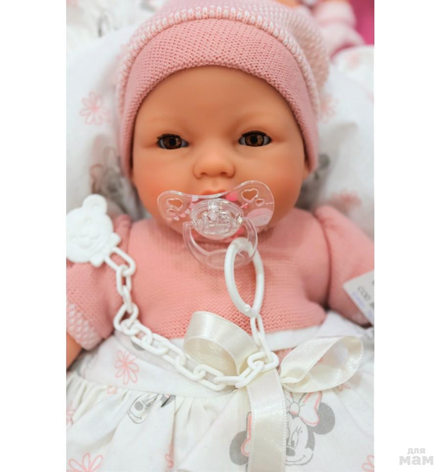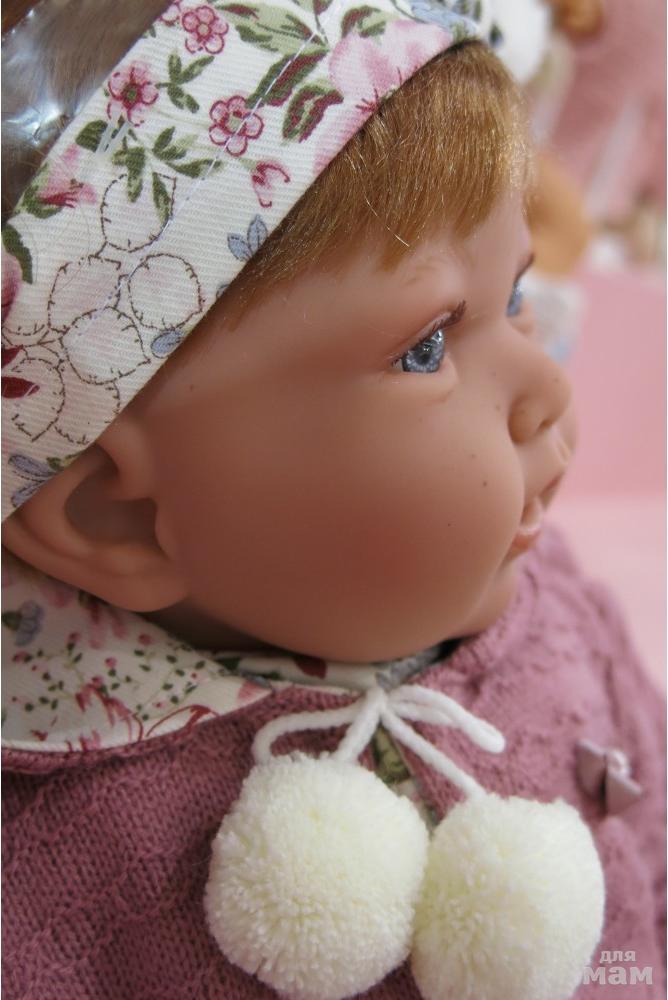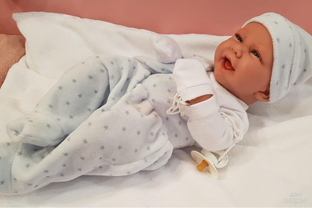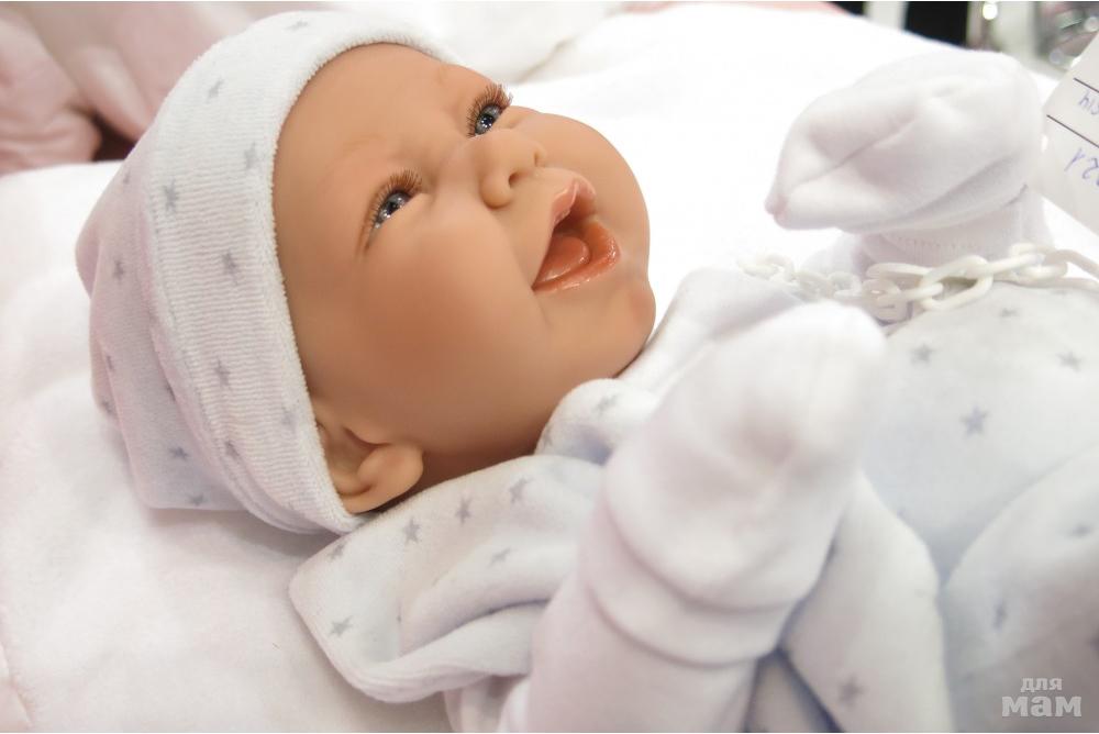 Мягконабивные куклы как правило все озвученные. Голова, руки и ноги выполнены из винила, тело набивное, внутри тела встроен динамик, который при нажатии выдает звук. Куклы могут плакать, гулить, говорить мама и папа, смеяться.