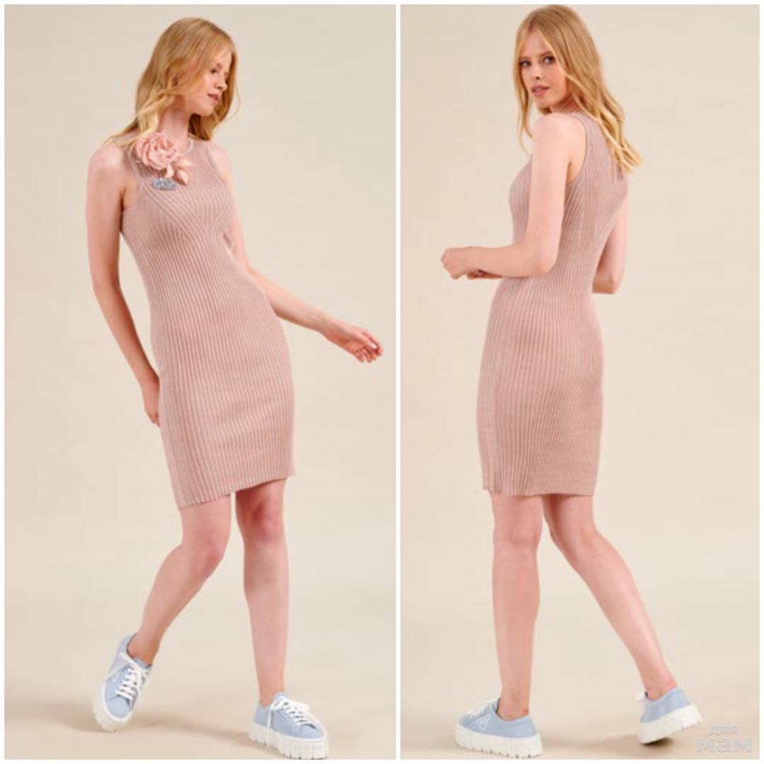 Соблазнительное трикотажное платье прилегающего силуэта выполнено из смесовой хлопковой пряжи с вискозой. Модель вывязана эластичным переплетением – ластик со смещением петель по диагонали. Линия горловины округлой формы, так же, как и проймы обработана миниатюрной бейкой. Изделие декорировано цветком и брошью ручной работы. Платье представлено в одном цвете.