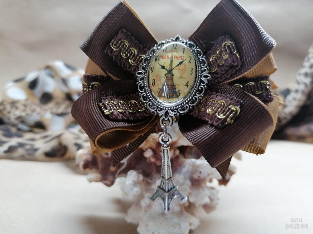 5) Кабошон с подвеской. Бантик в шоколадных тонах. Нижние ленты с рисунком в тематике Париж