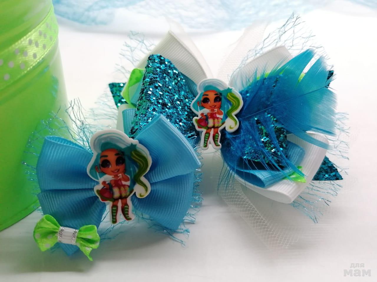 3) Большой и маленький бантик в одном стиле. Все без основы! Можно на заколку стрелу, на ободок, на резинку или на автомат. Размер по крайним точкам сеточки (!) 12 см и 6 см.