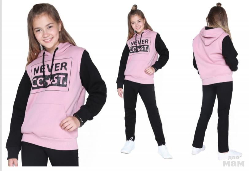 Футер начес 3х нитка. Рукава у всех цветов черные, меняется по цвету только грудь и спинка. Брюки заужены, резинке внизу, вверху резинка и утяжка, карманы. Декор- принт с глитером.