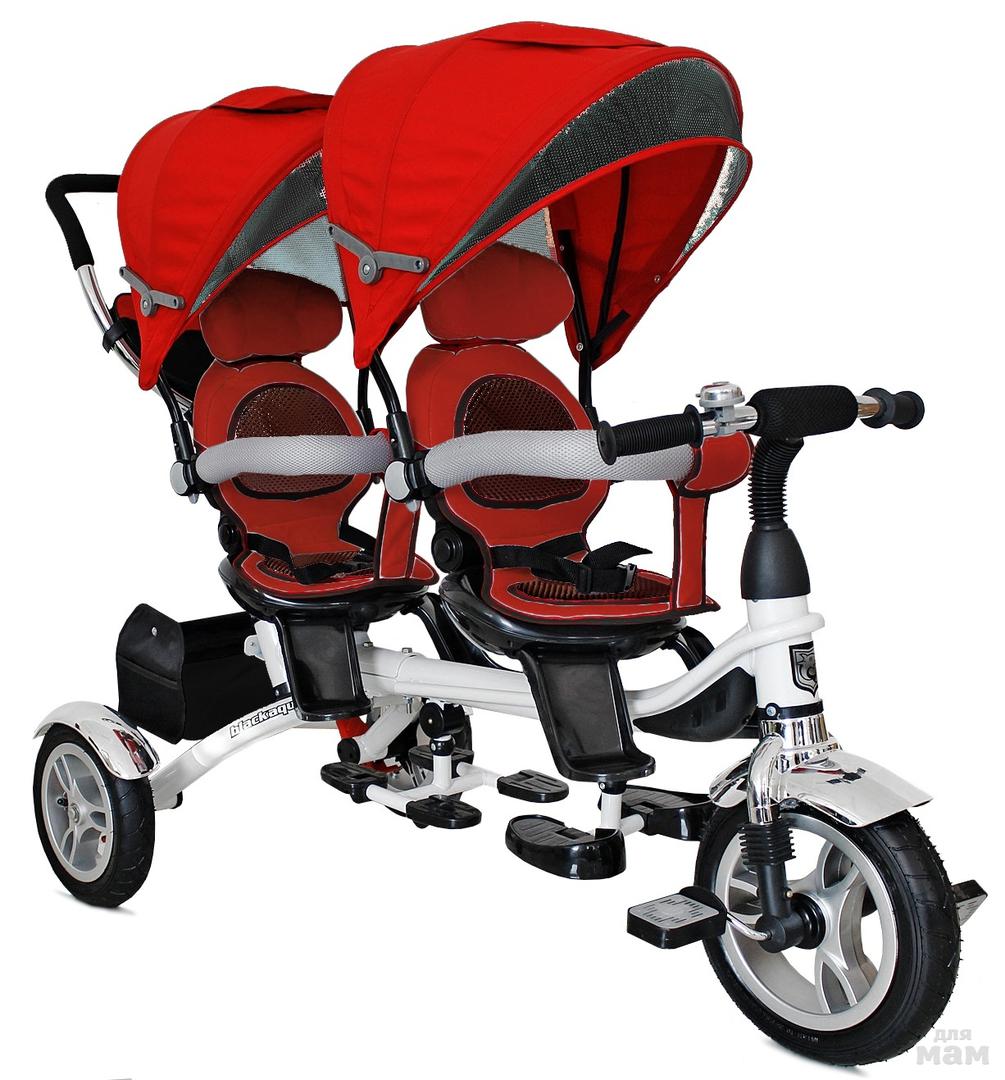 Велосипед рассчитан на двоих детей. Комфортные сиденья с ограничителями, позволяют развернуть детей лицом друг к другу или по ходу движения. Каждое место оборудовано отдельным козырьком и подножками. Оснащен удобной, усиленной ручкой управления и корзиной для мелочей.