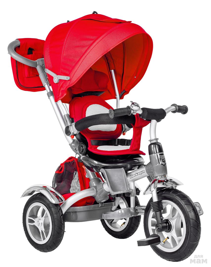 Колеса резиновые, надувные. Оснащен, выдвижным глубоким козырьком, защищающим от солнца, ручкой-толкателем с независимым управлением, подножкой, страховочным ободом с мягкой обивкой, мягким вкладышем на сидение, корзиной для мелочей. Сиденье велосипеда позволяет развернуть малыша как по ходу движения так и лицом к маме.