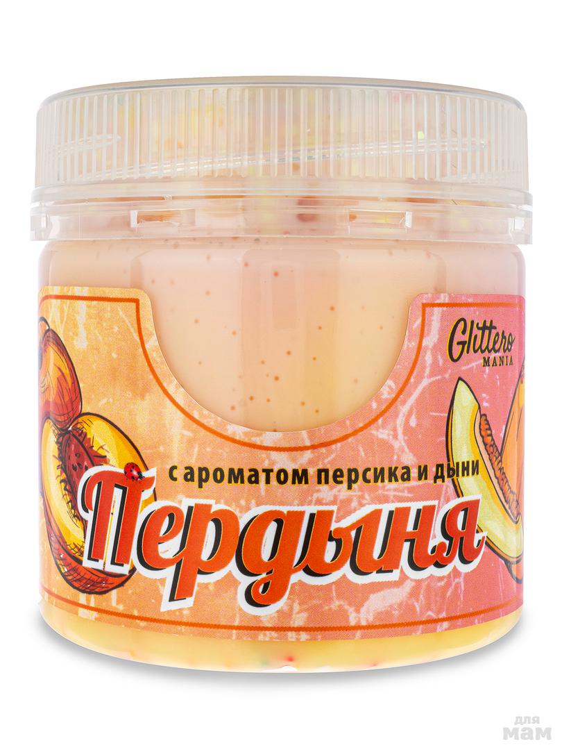 Слайм "Пердыня” Слайм с ароматом персика и дыни Состоит из двух частей, розовая с ароматом персика, желтая-дыни. Украшен пенопластовыми шариками, так напоминающими спелые дыньки.