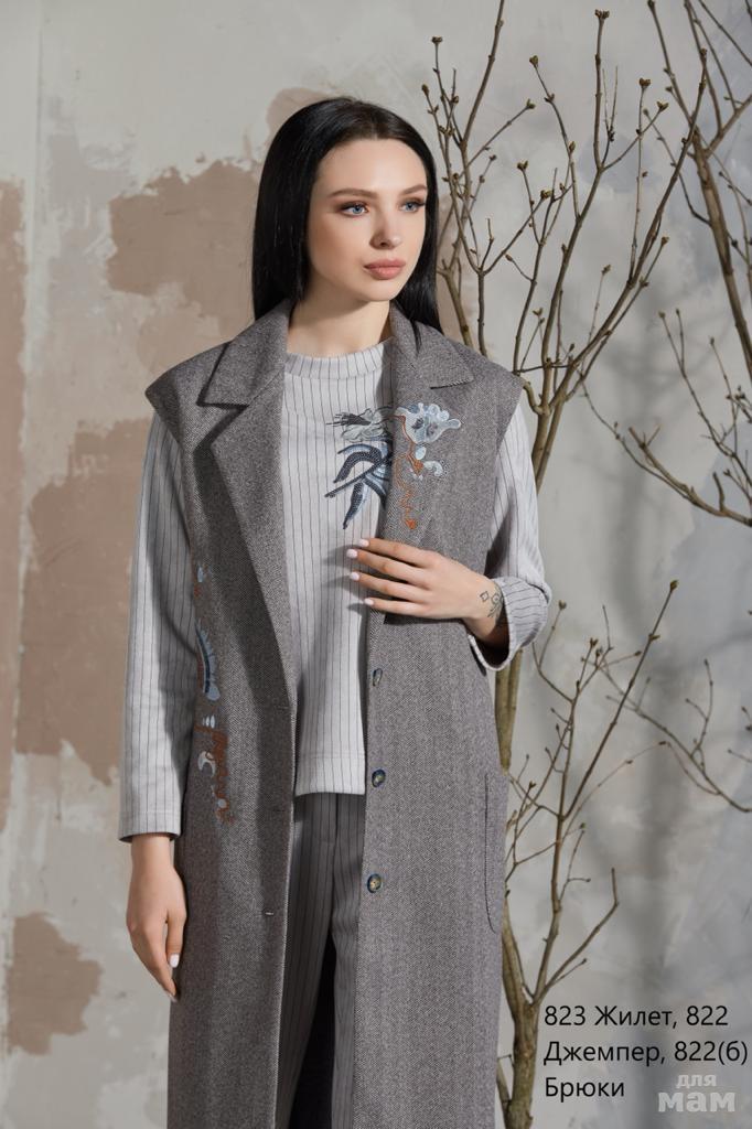 Удлиненный стильный жилет - универсальная вещь в гардеробе. Модель свободного прямого силуэта . Мягкая линия горловины со спущенной линией плеча , по переду выполнены накладные карманы. Полочка и лацкан декорированы дизайнерской вышивкой.