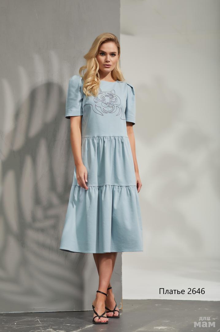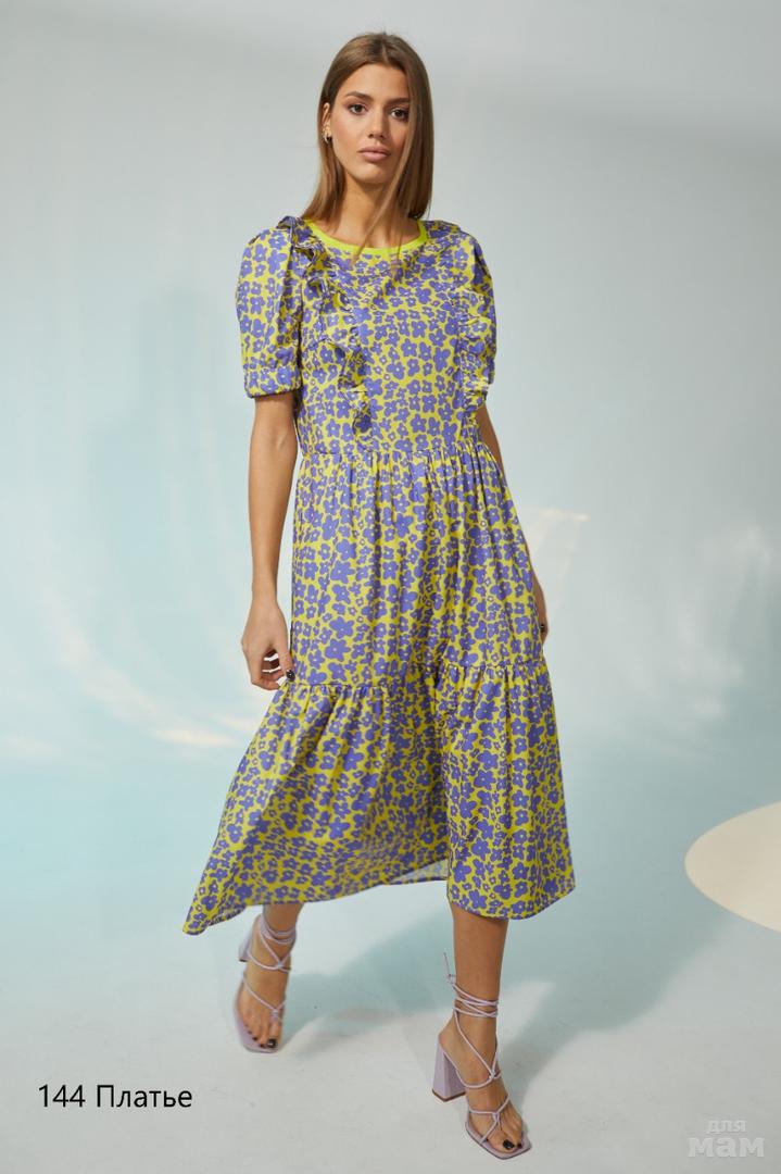 Изящное модное платье. Модель свободной формы полуприлегающего силуэта расширенное к низу. Платье отрезное чуть выше линии талии с двумя ярусами воланов. Горловина декорирована контрастным хлопковым довязом. Низ рукава на резинке
