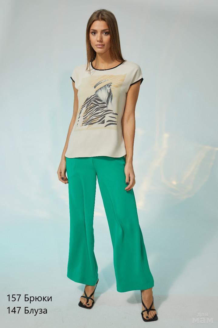 Брюки средней посадки прямого покроя. В пояс брюк вставлена резинка. В боковых швах карманы.
