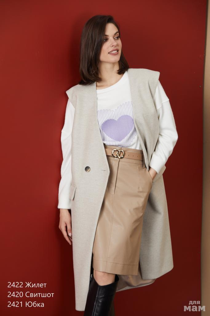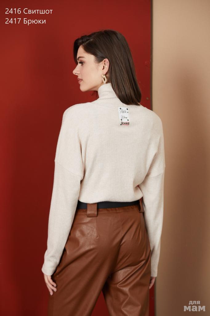 Стильный мягкий свитшот из вязаного трикотажного полотна, со спущенным плечом. Горловина декорирована воротником из основной тками.