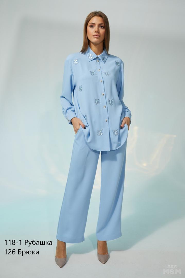 Рубашка прямого силуэта с фигурным низом. Выполнена застежка на петли и пуговицы. По горловине стояче-отложной воротник с отрезной стойкой. По спинке кокетка и склада на свободу движения. Рукав рубашечного кроя с манжетой по низу. Перед рубашки и воротник декорированы дизайнерской вышивкой.