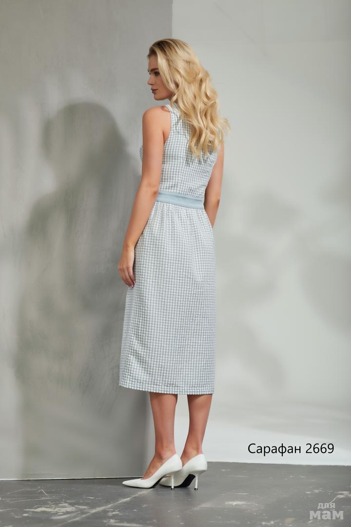 Сарафан приталенного силуэта, с фигурным вырезом по горловине переда из нежного хлопка. Облегающий лиф переда выполнен из нескольких частей. По нижней части юбки переда карманы и планка на петли и пуговицы. В верхней части спинки талиевые вытачки. В сарафане отрезной пояс по линии талии с юбкой на сборку. В боковом шве молния.