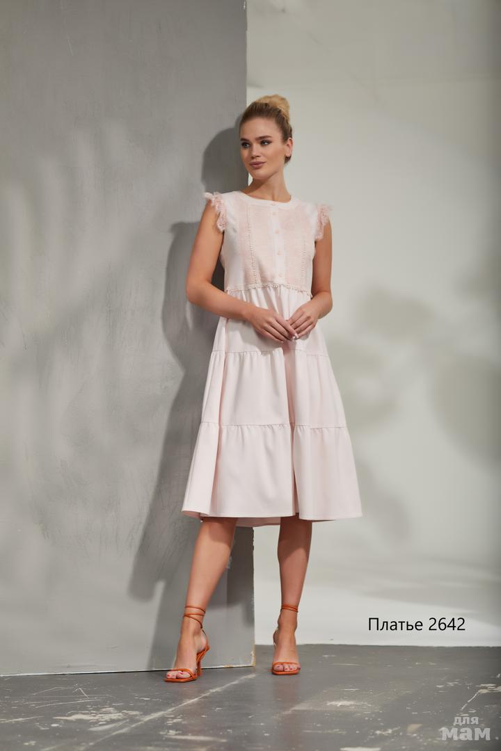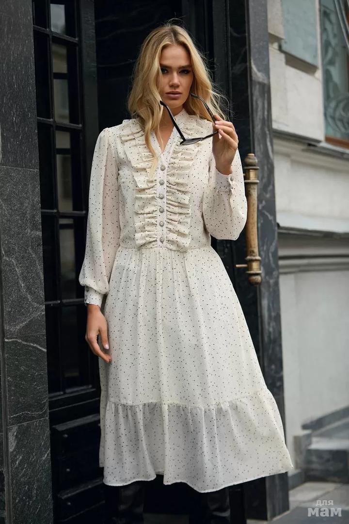 Женственное платье приталенного силуэта, с отделочным объёмным воротником. Верхняя часть спинки украшена функциональной застежкой на петли и пуговицы. Нежность образу придаёт втачной рукав с мягкими складками по окату.