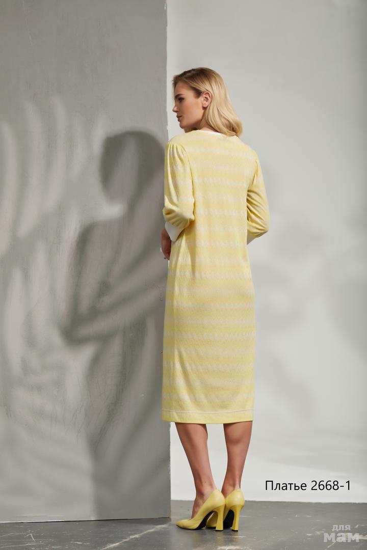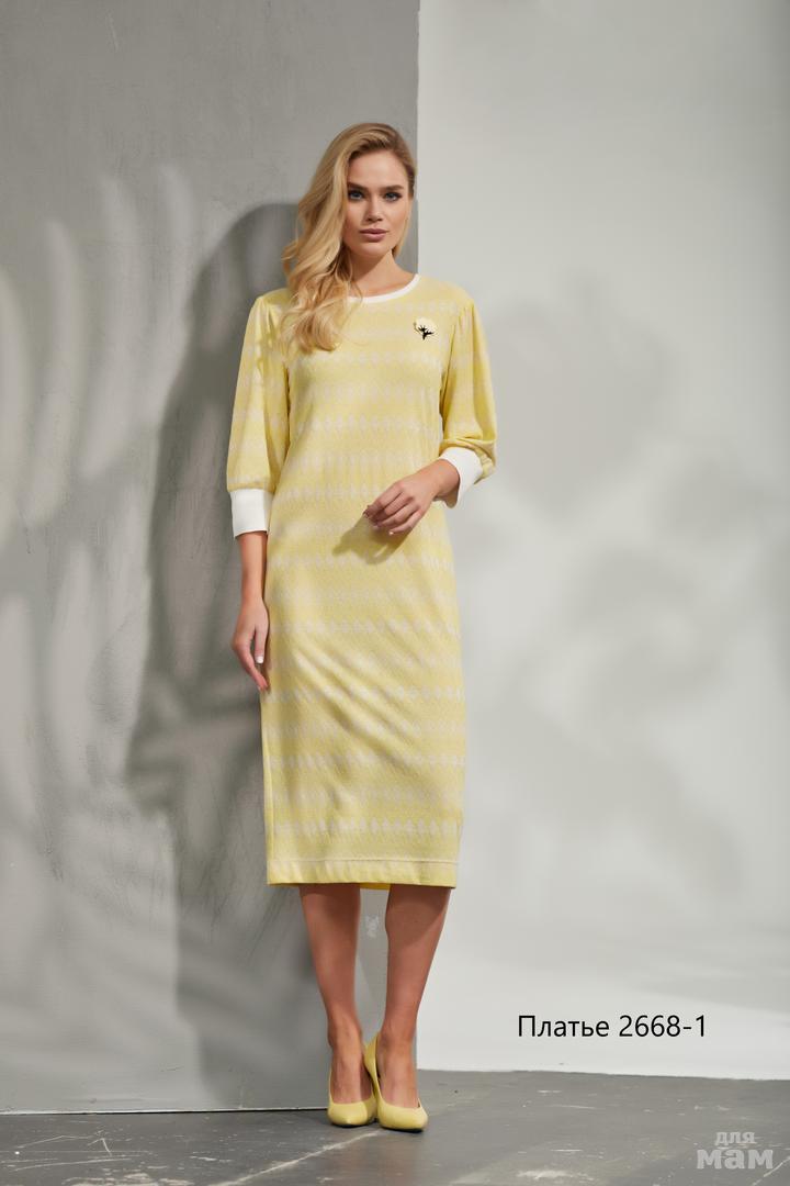 Модное платье прямого покроя из нежного трикотажного полотна, нежно желтой расветки. Модель с втачным рукавом со сборкой. Горловина, манжеты рукава декорированы довязом. Перед платья декорирован брошью.