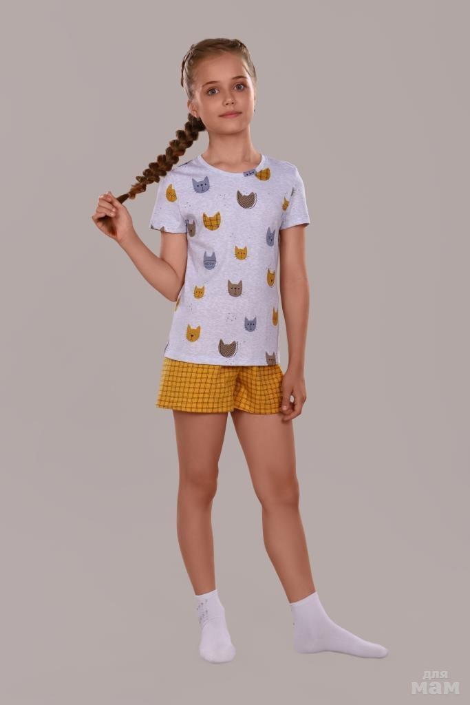 Пижама для девочки "Кошки" арт.ПД-009-024 серый меланж/горчичный, цена 625+орг