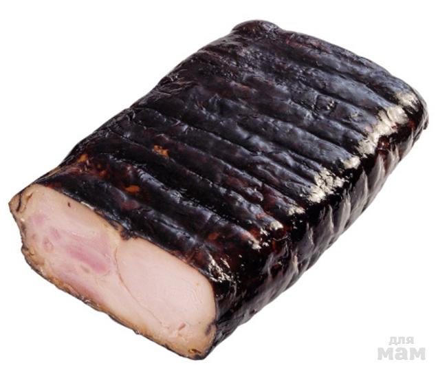Описание: Большой объем, насыщенный вкус, сочность и мягкость благодаря прослойкам сала, аромат копчения, отсутствие кости, мягкая корочка - основные характеристики этого продукта.