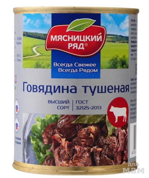 Состав: Говядина, жир говяжий, лук, соль, перец черный молотый, лист лавровый. Массовая доля мяса и жира не менее 58%.