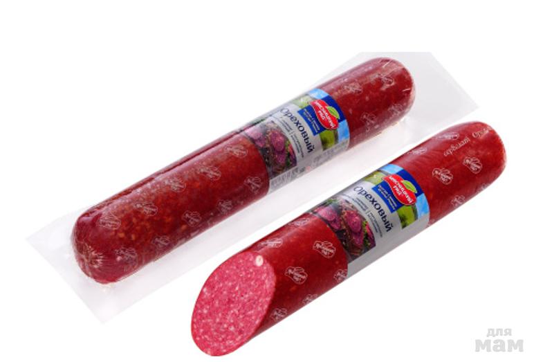 Состав: свинина, шпик, говядина, вода, нитритная соль (соль поваренная, фиксатор окраски (нитрит натрия), орех кедровый, животный белок, молочный белок, глюкоза, стабилизаторы (Е 1412, Е450, Е 1450), регулятор кислотности (E451), усилители вкуса и аромата (глутамат натрия, гуанилат натрия, инозинат натрия), ароматизаторы, антиокислители (аскорбиновая кислота, изоаскорбат натрия, аскорбат натрия, лимонная кислота), натуральные ароматизаторы (кориандр, черный и белый перец, мускатный орех, кардамон), подсластитель (Е 960), гемоглобин сухой, краситель (кармин), желатин, эмульгатор (Е 471), загуститель (Е 1422).