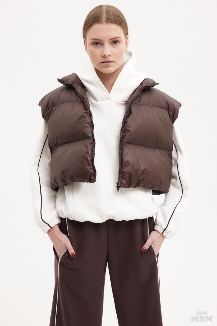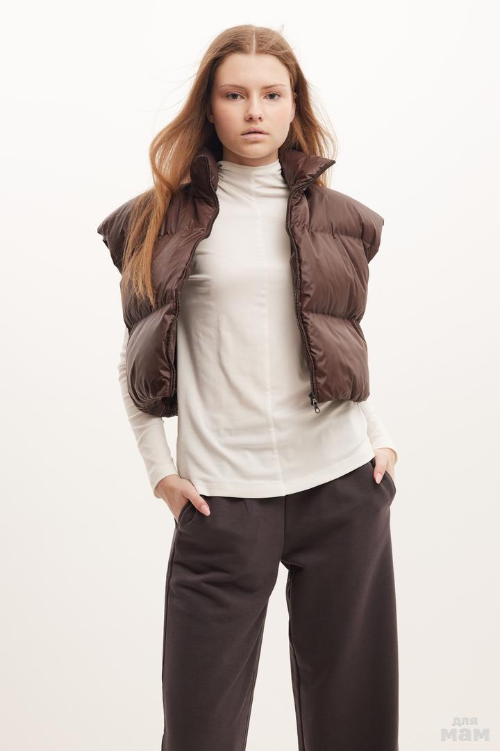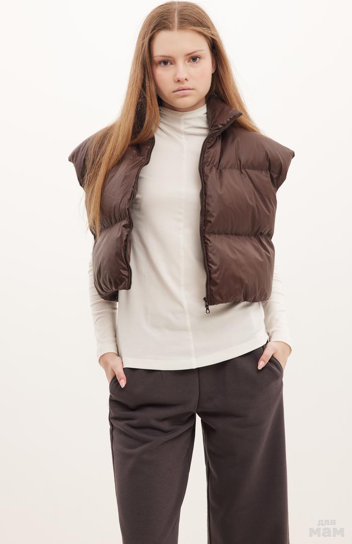 25173 Жилет короткий,эко пух,молния коричневый 100% полиестер 134-146 цена 4580+орг 152-164 170 /176 S-M цена 4580 +орг