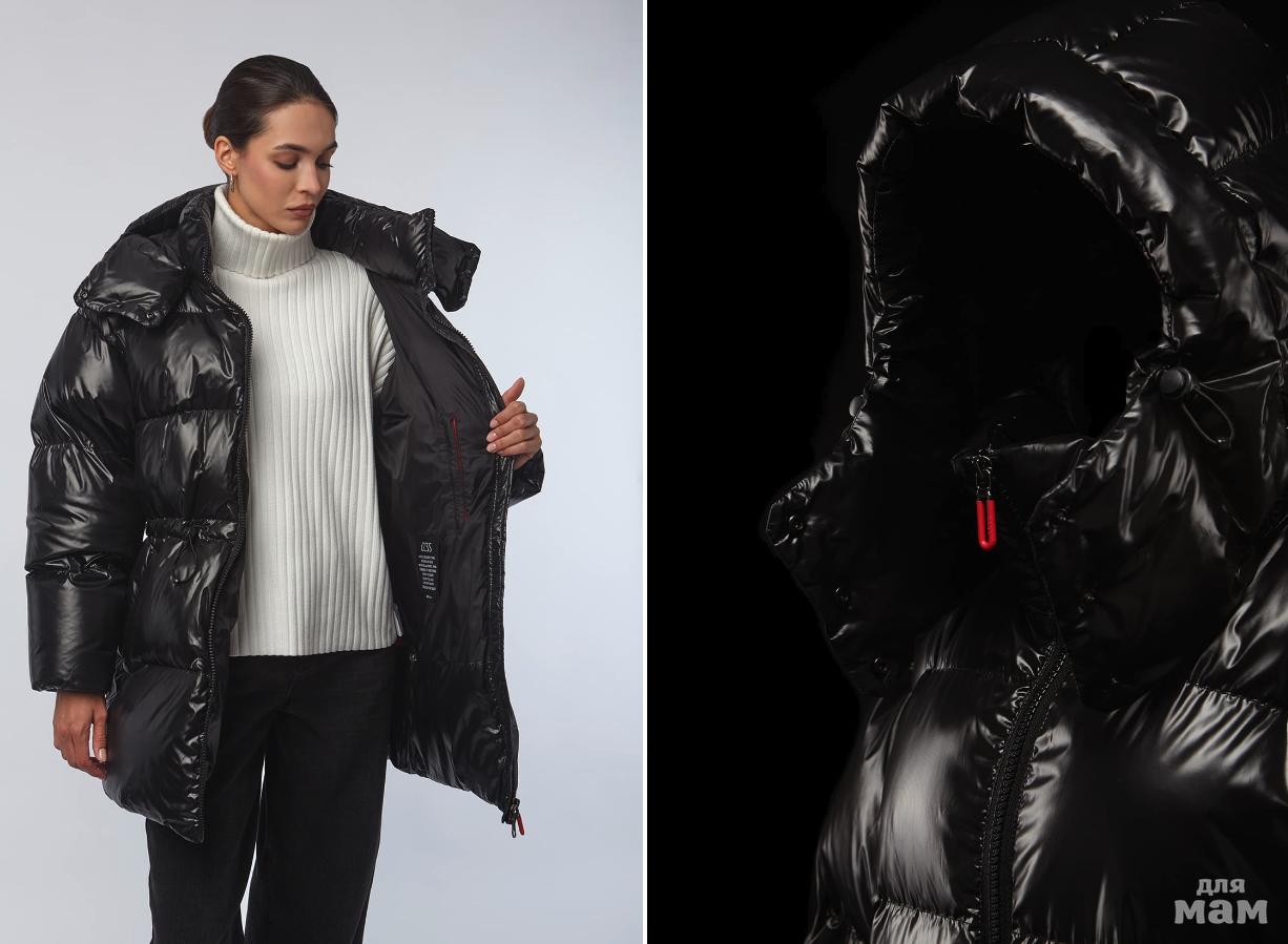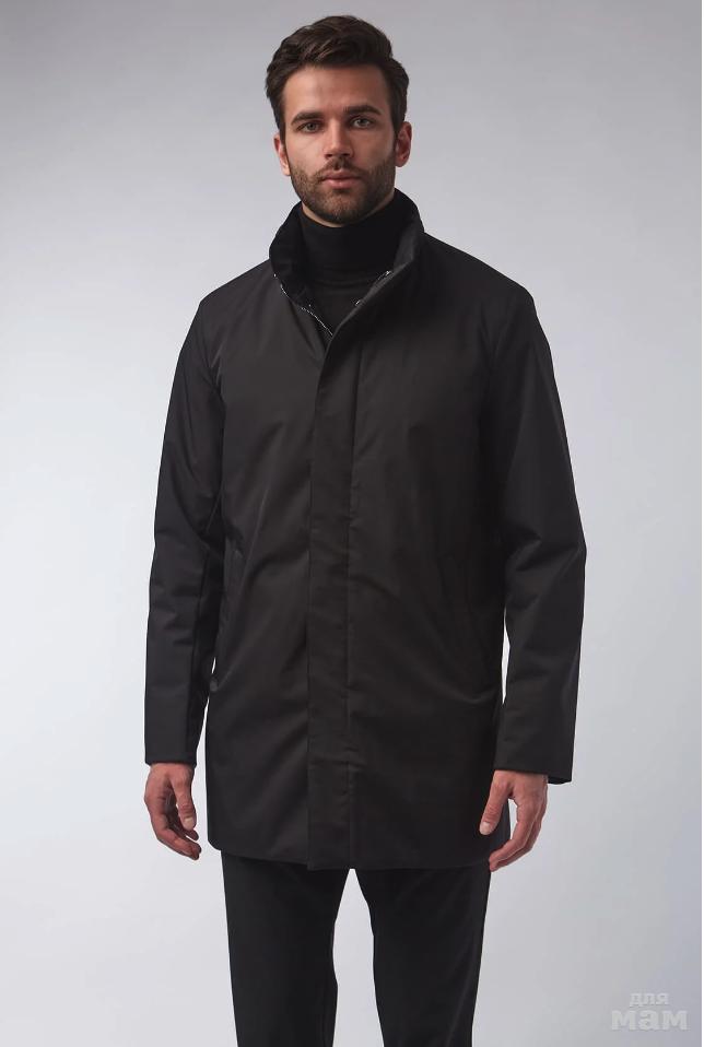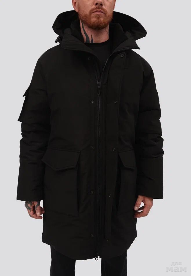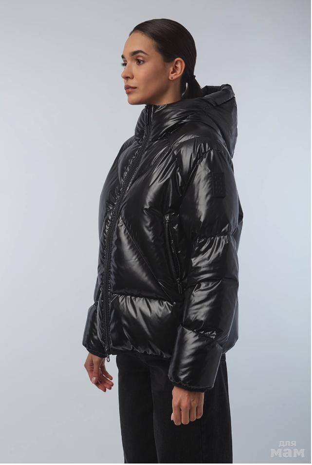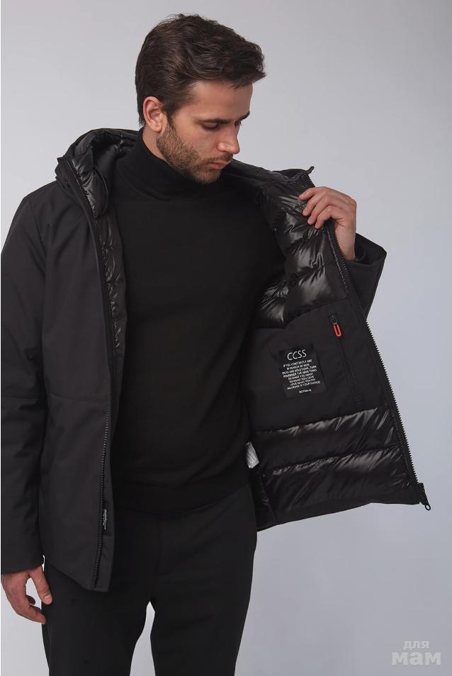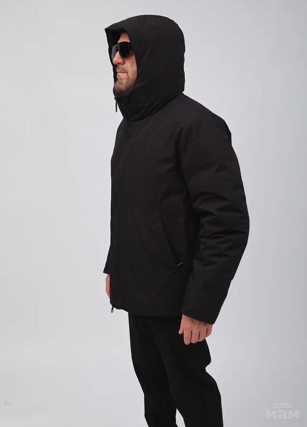 Утепленная куртка черного цвета. Центральная застежка на двухзамковой металлической молнии. Ветрозащитная планка на внутренних кнопках. Капюшон внутри воротника на молнии. Нижние карманы с листочками на молниях со скошенными входами. Правый внутренний карман с листочкой на молнии. Левый внутренний накладной карман на кнопке