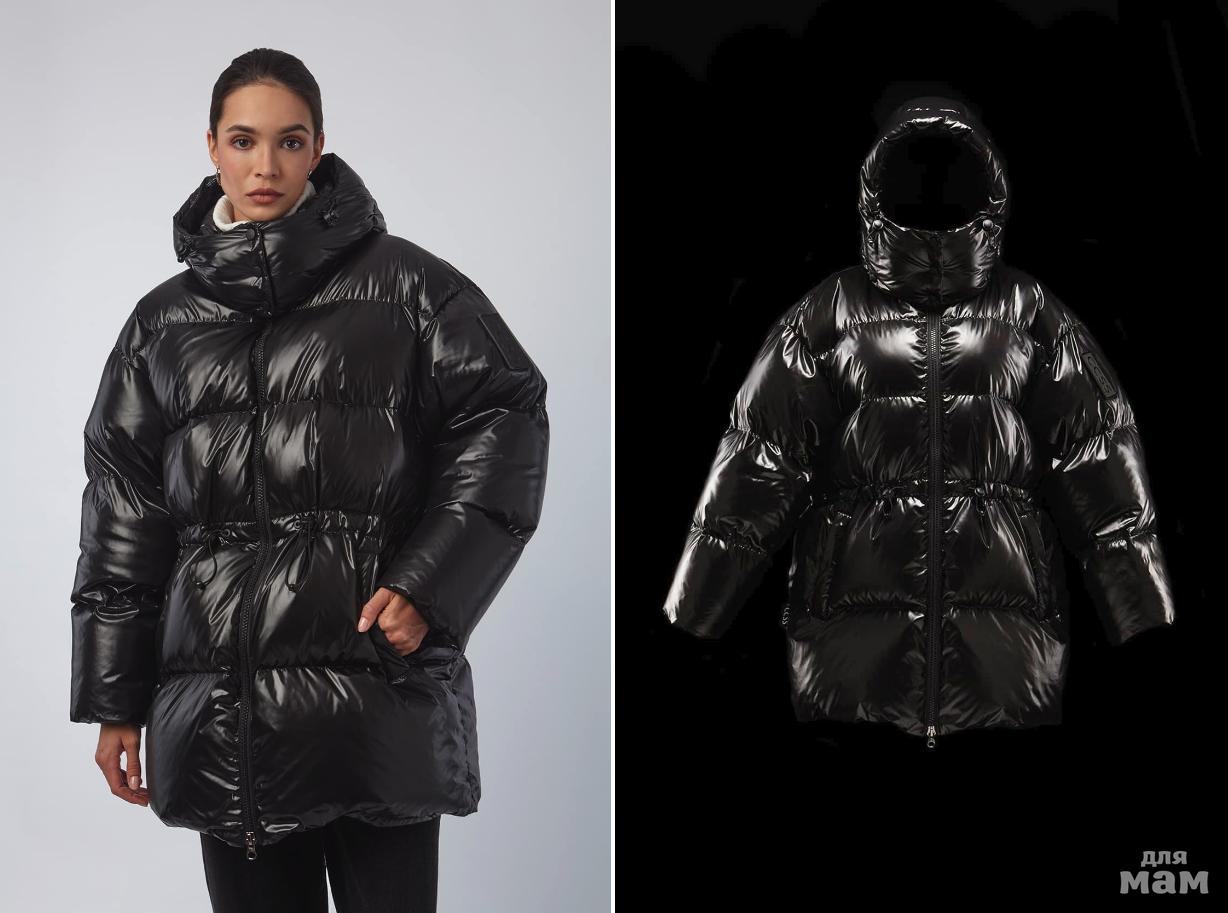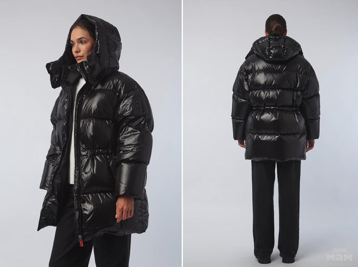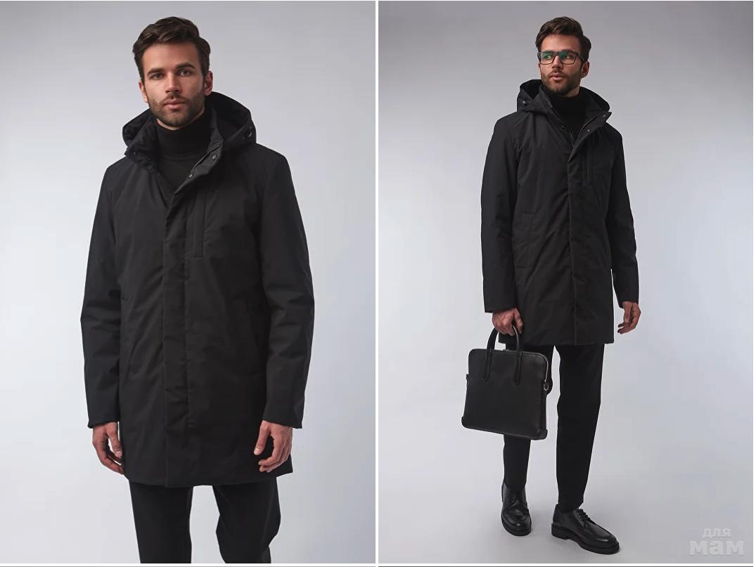 Утепленная куртка черного цвета. Центральная застежка на двухзамковой металлической молнии. Ветрозащитная планка на внутренних кнопках. Капюшон внутри воротника на молнии. Нижние карманы с листочками на молниях со скошенными входами. Правый внутренний карман с листочкой на молнии. Левый внутренний накладной карман на кнопке